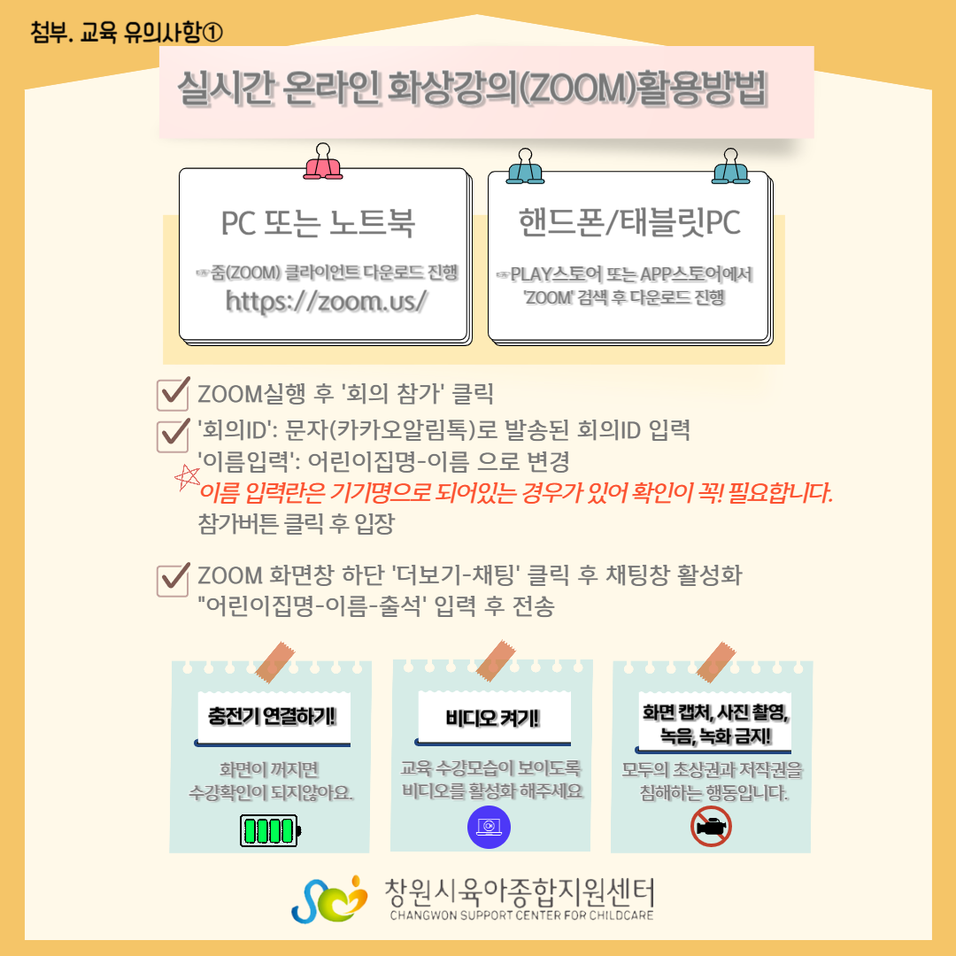 줌(zoom)사용 방법은 ‘보육자료실’ 내 ‘줌(zoom)이용 안내 매뉴얼’을 참조하시기 바랍니다.