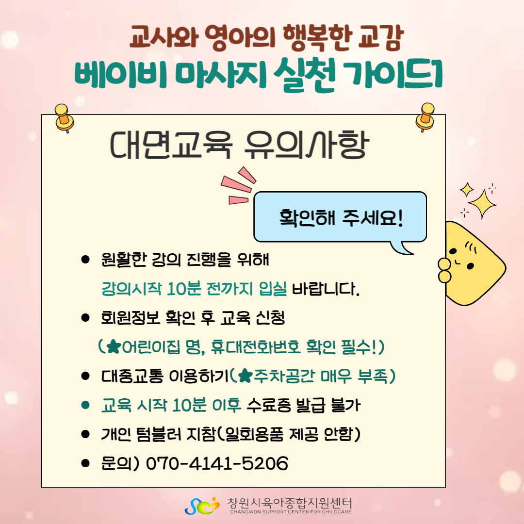 교육 취소는 교육 신청 후 참석하지 못할 경우 대기 중인 분들을 위하여 10일 전까지 센터(055-287-1216/내선3)로 전화 주시기 바랍니다.