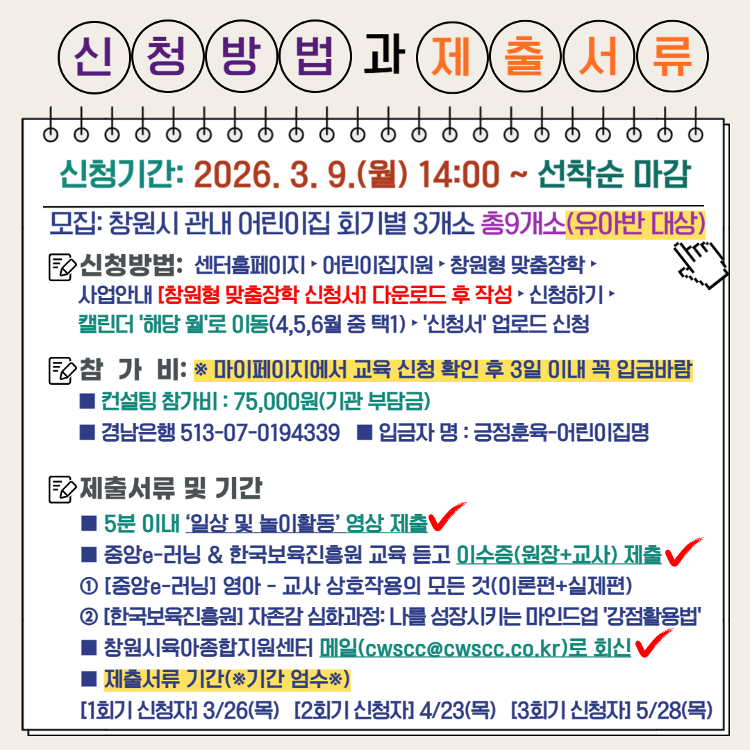 | 컨설팅비 | 유료(75000) 경남은행 513-07-0194339 (예금주:창원시육아종합지원센터) |