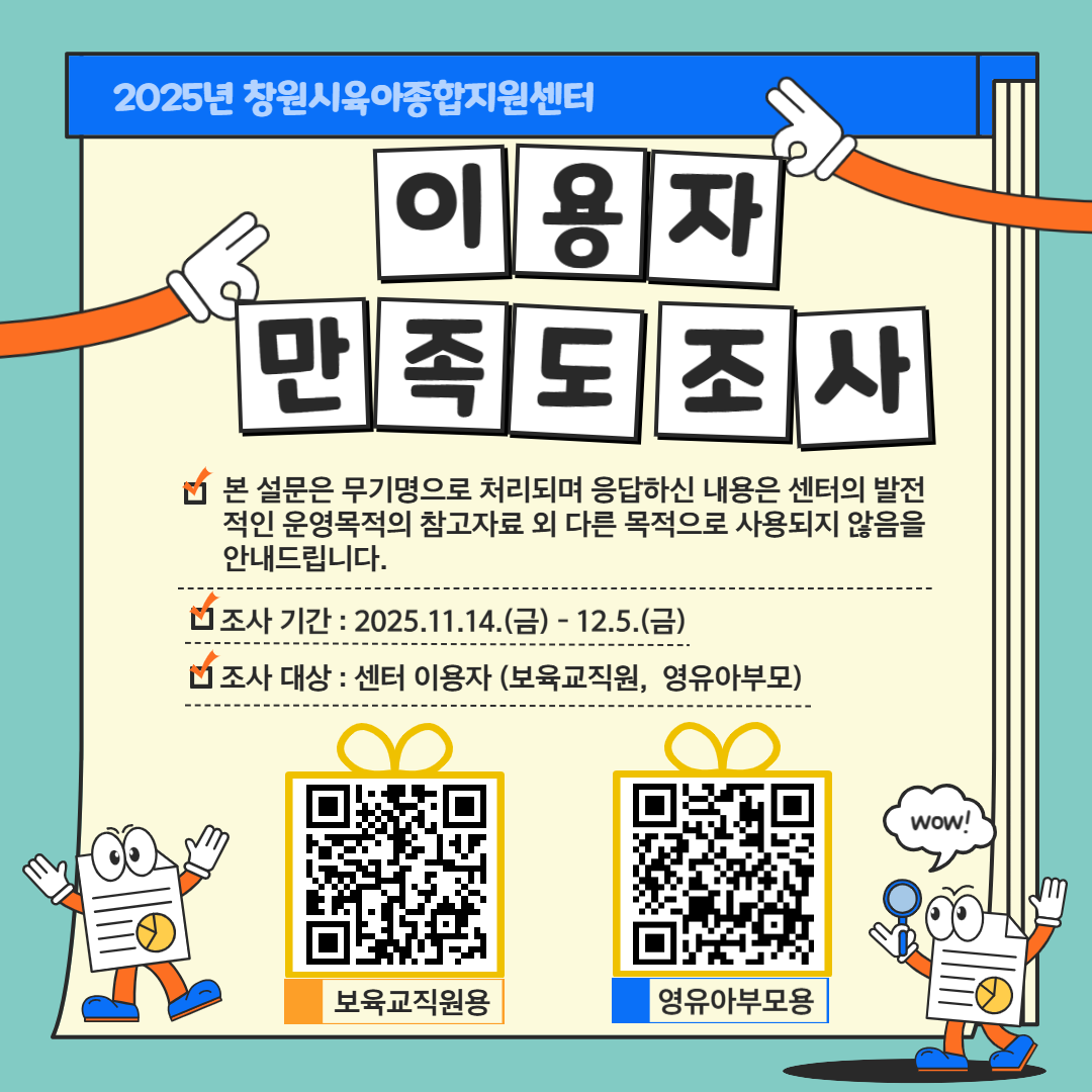센터에서는 2026년 진행될 어린이집지원사업을 계획하는데 의견을 반영하고자 2025년 만족도 및 수요도 조사를 실시하고자 하오니,