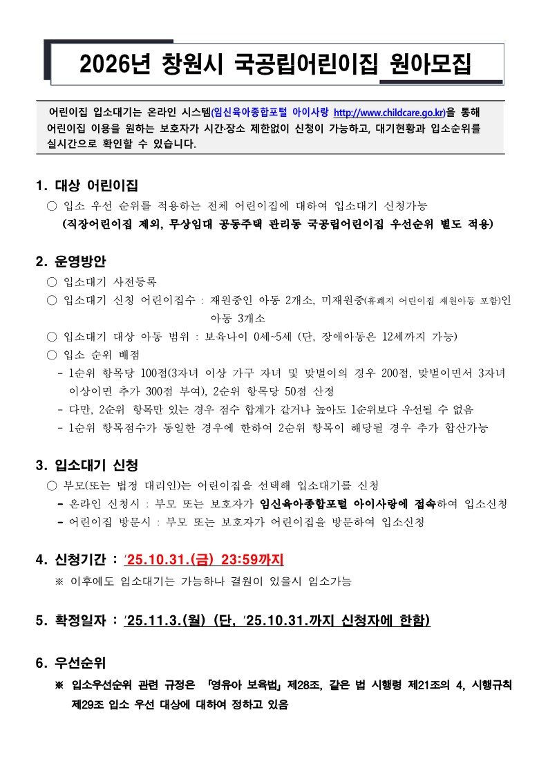 [안내] 2026년 창원시 국공립어린이집 원아모집 안내